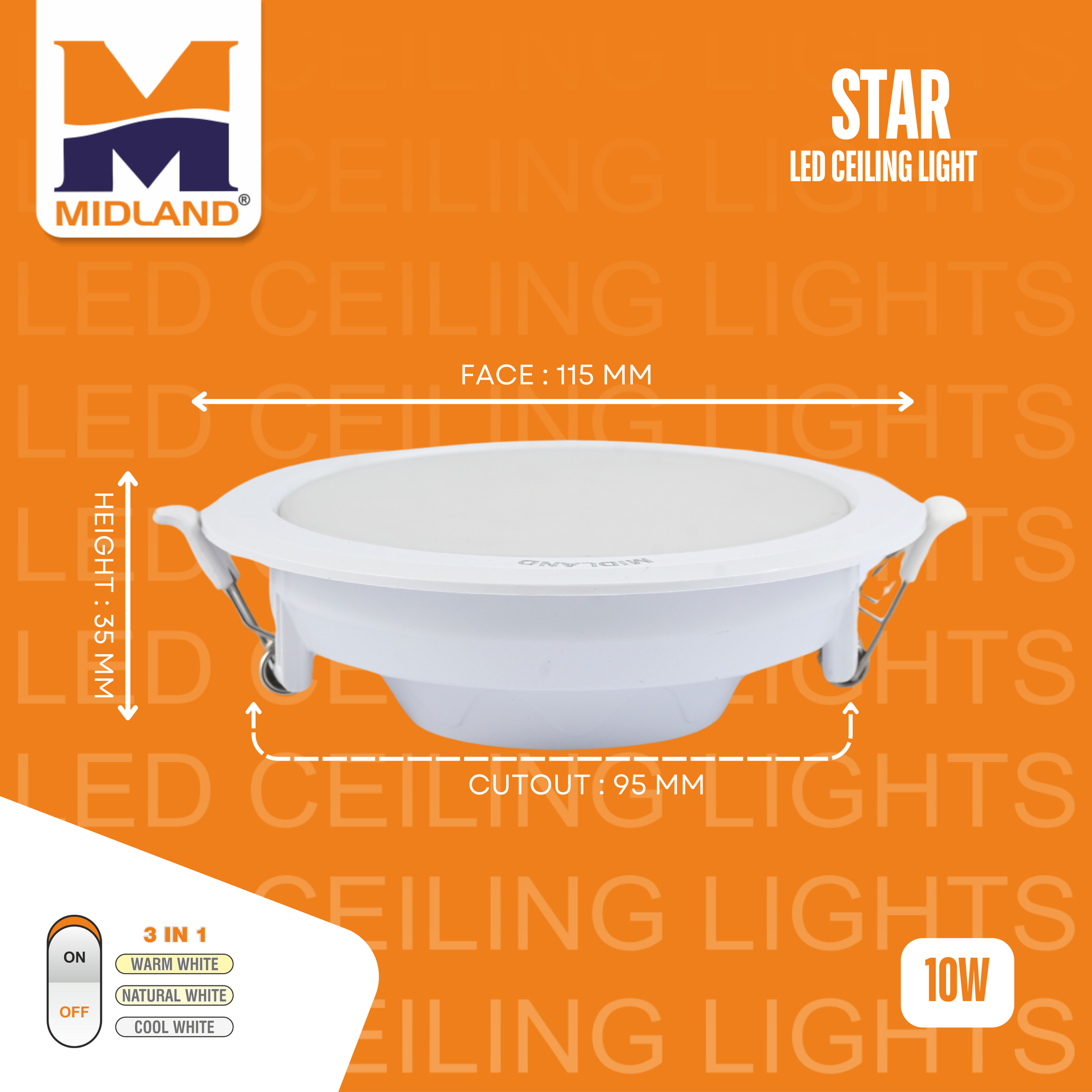 MIDLAND 10W STAR 3 IN 1 LED SQUARE CEILING LIGHT