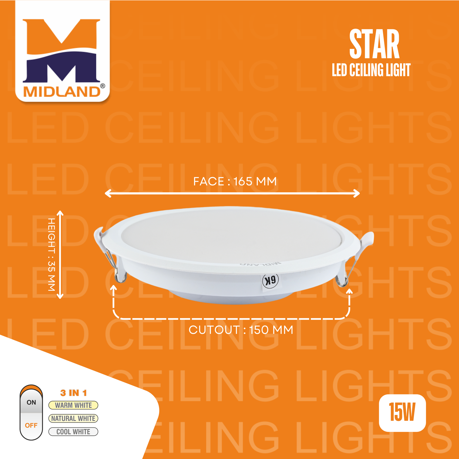 MIDLAND 15W STAR 3 IN 1 LED ROUND CEILING LIGHT